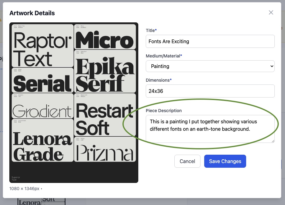- Piece Description: you're likely to see this (assuming the gallery enabled Piece Descriptions) when uploading art to a call. This is information about that specific piece only. Tell the jurors exactly what they're looking at here!