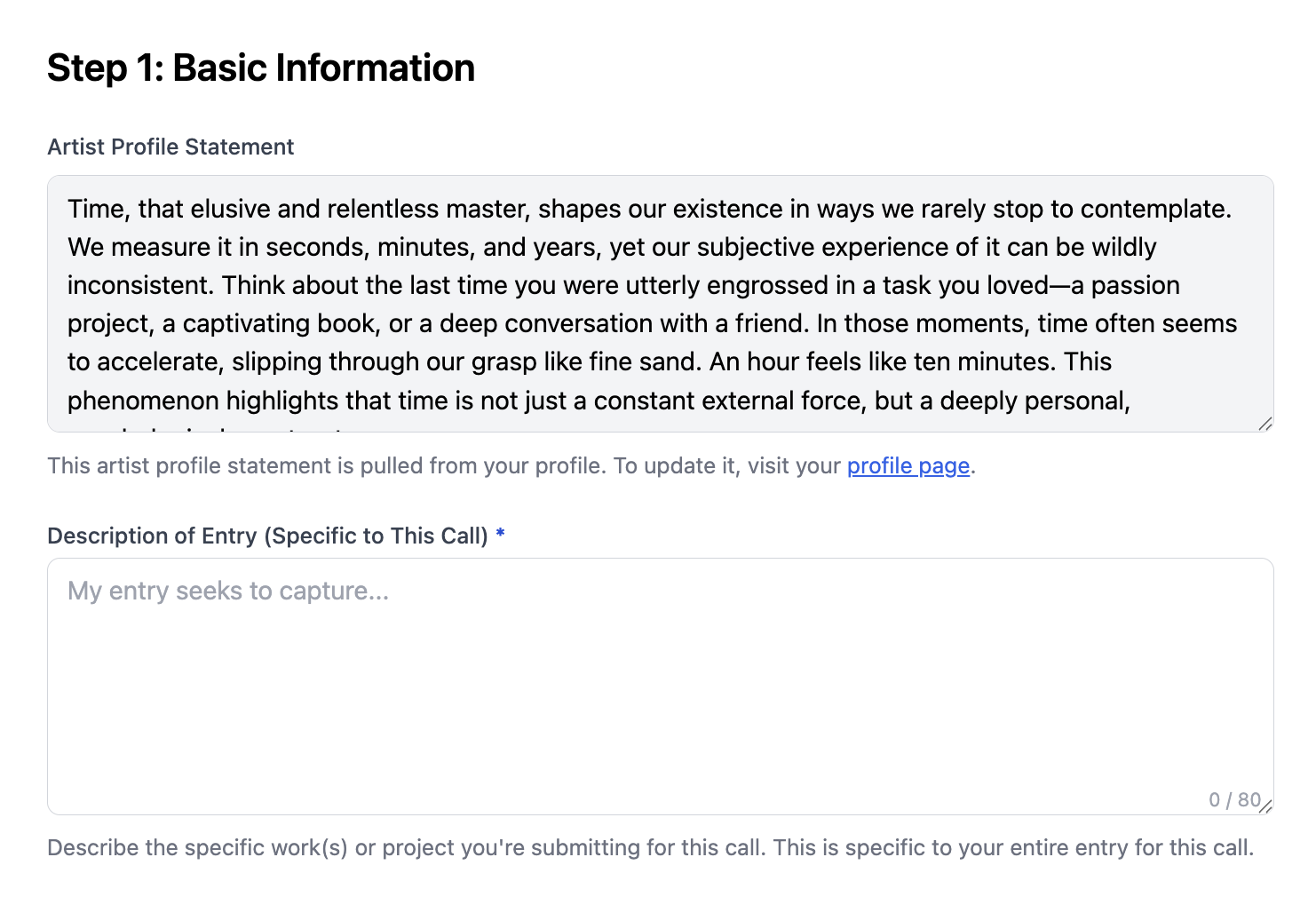 - Artist Profile Statement: this is a general statement that relates to you as an artist. What kind of art you make, where you take inspiration from, what kind of mediums you typically use, etc. If a gallery requests it for a call, you will see it populate on the first page when applying to an entry, but it'll be greyed out and you won't be able to edit it. That is because you edit this at the profile level, not per call. Meaning, to change it, you edit your statement on your artist profile!