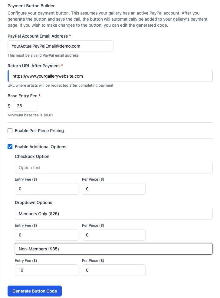 When creating or editing a call, scroll all the way down to the bottom of the form. There, you can fill out your email address (it is critical that this matches the email address of your PayPal account) and the website URL that you want artists to be redirected to after they pay. In this example, the base fee is set as $25. After filling out your preferences, you must press the Generate Button Code button and save your call.