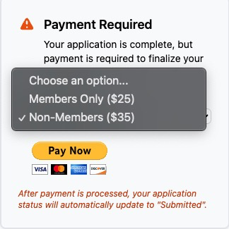 These inputs will charge members the base fee of $25 only and non-members an additional $10, or $35. An artist will see the following:
